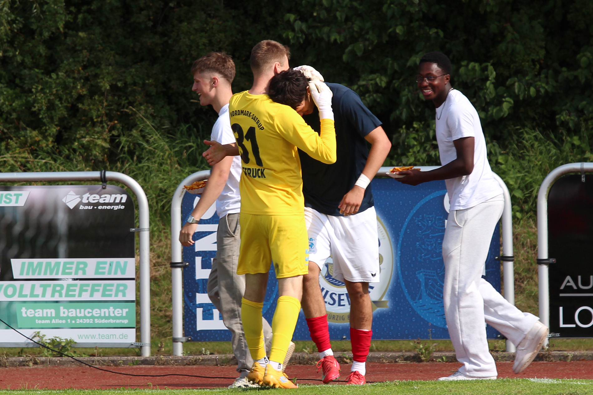 Die zweite Hälfte hätte für den TSV Nordmark Satrup nicht besser starten können: Aus dem Gewühl heraus traf der 18-jährige Edvin Skrijelj zum 3:0 (49.). „Das Tor freut mich sehr für ihn“, sagt Lars Meyer, der sich an diesem Nachmittag eigentlich keine Sorgen mehr machen musste, denn seine Mannschaft ließ weiterhin nichts zu, spielte sich mit einfachem Fußball zum Erfolg. Den Schlusspunkt setzte der Sekunden zuvor eingewechselte Joris Naeve, als er in der 89. Minute aus 16 Metern traf.