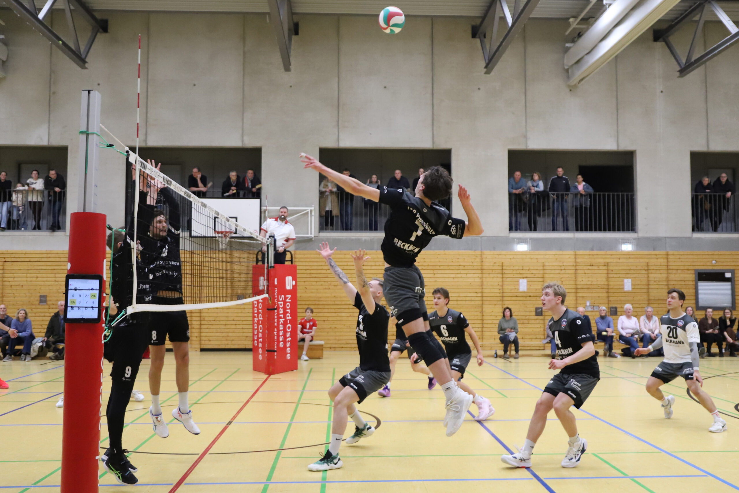 Im ersten Satz konnten die Flensburger nach nervösem Beginn zunächst mithalten und lagen zwischenzeitlich sogar mit 21:20 in Führung. Möglich wurde dies vor allem durch eine gute Abwehrarbeit und druckvolle Aufschläge, mit denen das Team den Favoriten immer wieder unter Druck setze. Schlussendlich fehlte jedoch die letzte Durchschlagskraft im Angriff, sodass der Satz am Ende mit 23:25 an den Gegner ging. „Wir waren an sehr vielen Bällen dran, konnten aber unsere Chancen am Ende nicht nutzen“, betonte Coach Gunnar Hansen.
