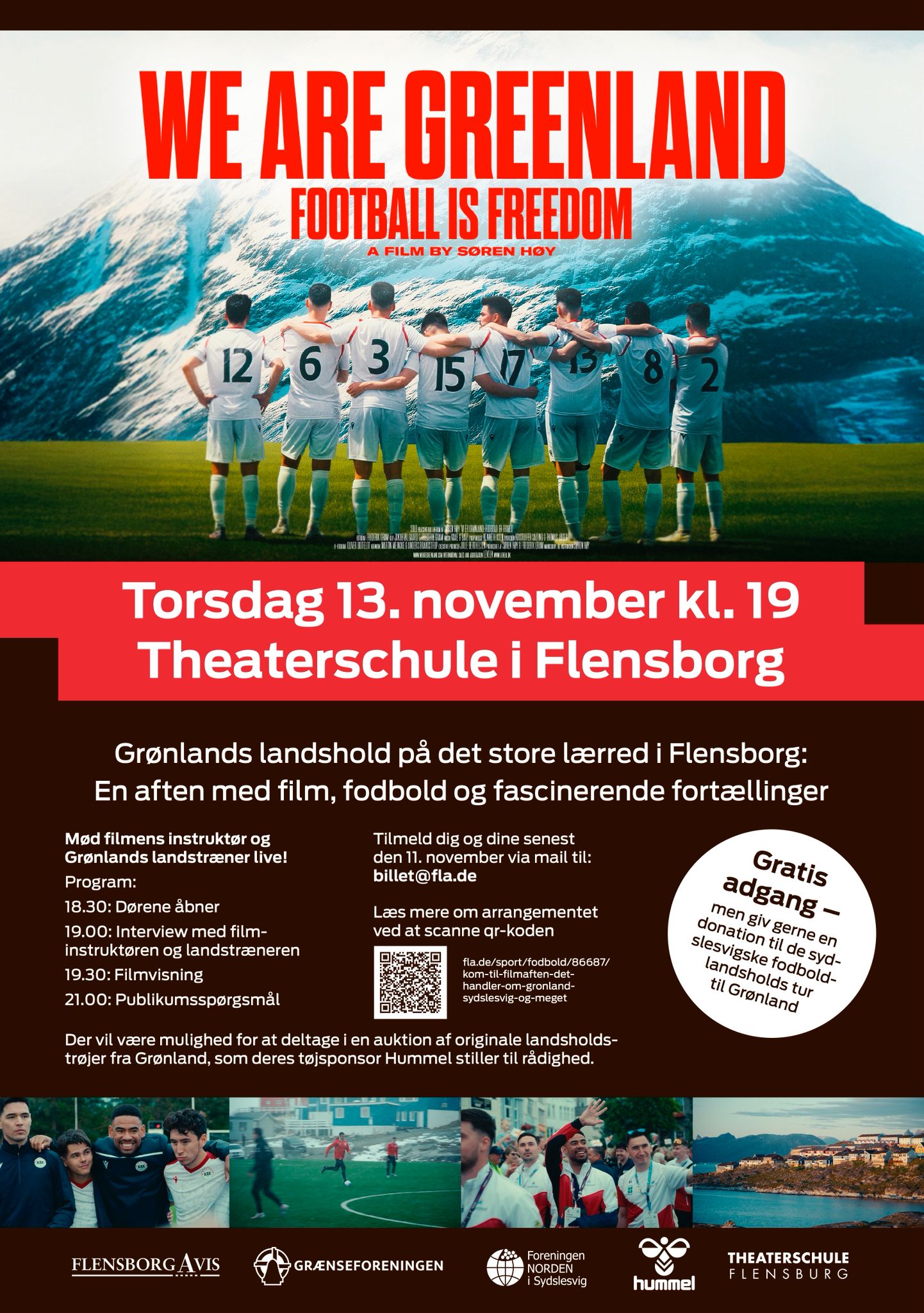 Flensburg – Fußball ist mehr als nur ein Spiel – das zeigt der dänische Regisseur Søren Høy in seinem eindrucksvollen Dokumentarfilm „We Are Greenland – Football is Freedom“, der am Donnerstag, 13. November, um 19 Uhr in der Theaterschule Flensburg gezeigt wird. Der Eintritt ist frei, doch Spenden für die geplante Reise der südschleswigschen Fußballauswahl nach Grönland im kommenden Jahr sind willkommen.